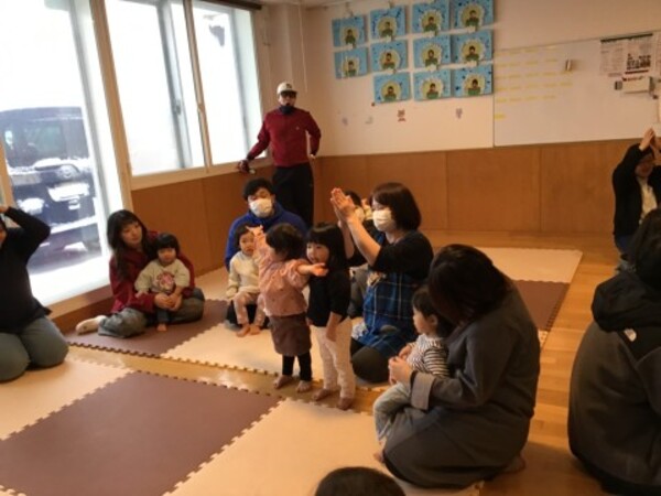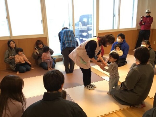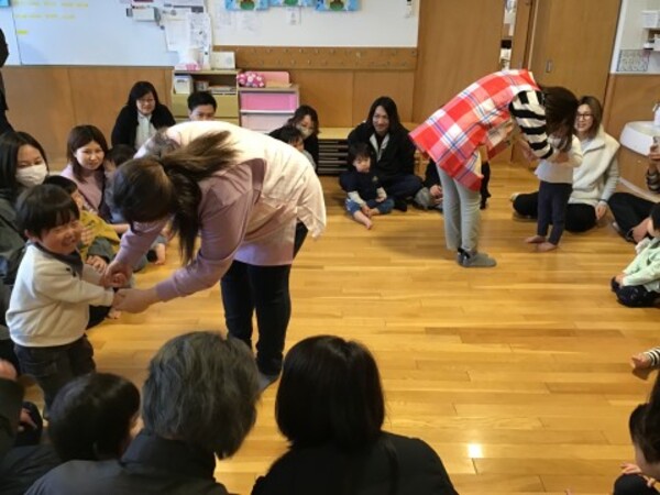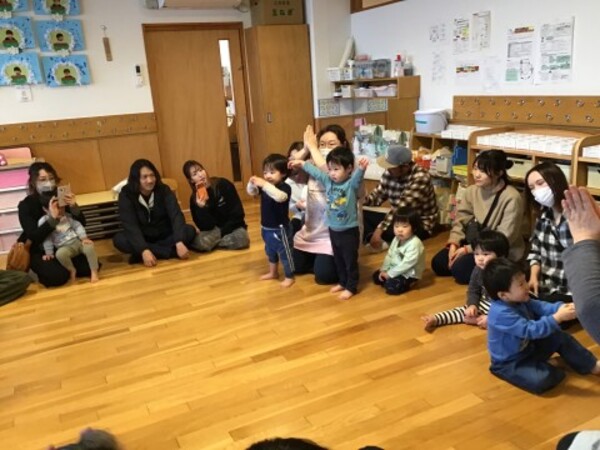 | 2月12日(木)星組(1歳児)のわらべうた公開日がありました。 おうちの方々の姿を見て泣いてしまうお友だちもいましたが、「お茶をのみに きてください」や「たけのこ めだした」などのわらべうた遊びを親子で楽しみ最後は、星組(1歳児)のお友だちが大好きな「こちょこちょ列車」。ふれあい遊で盛り上がりました。 たくさんのご参加ありがとうございました。 |