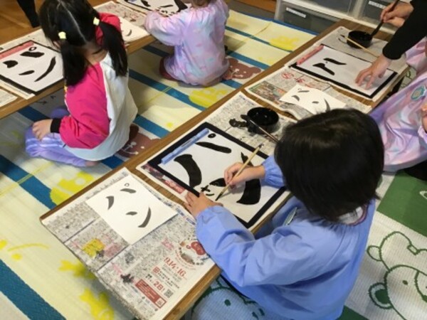 | 11月28日(金)宙組(5歳児)の書道教室と西山先生の運動あそびがありました。 書道教室から始まるAグループ。 今月は、カタカナに挑戦‼️「パン」を書きました。「パ」のまるの部分は筆の先を使い、ほかの部分は筆の根元まで使い大きく書くように教えていただき3枚の作品を書き上げました。 最後まで頑張って集中して書き上げたAグループのお友だちでした。 書道教室の後は、西山先生の運動あそび。 長縄跳びのひとり跳び、次は呼吸を合わせてふたり跳び、全員が失敗しないで1回づつ順番にひと回り跳ぶことができました✌️ 最後に、ドッチボールが上手になるためにボールをキャッチする練習もしました。ペアーになったお友だちと歓声をあげながら楽しんでいました。 |