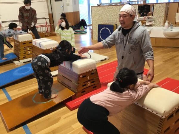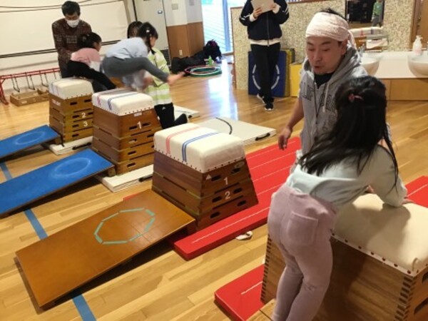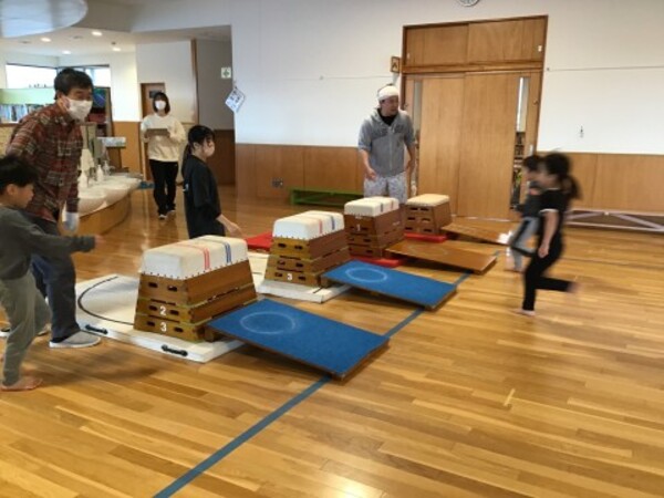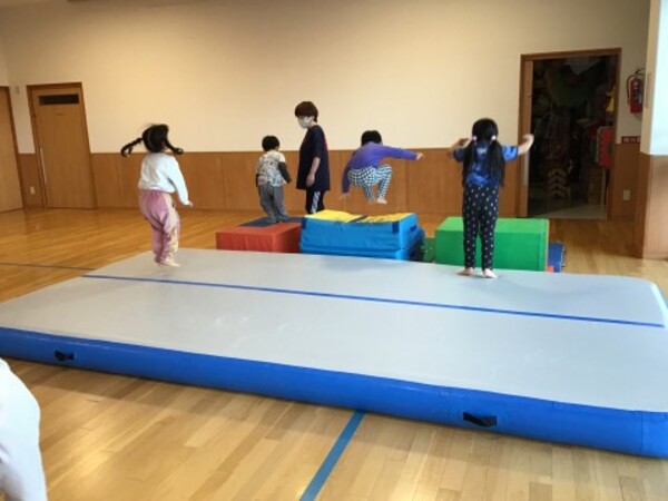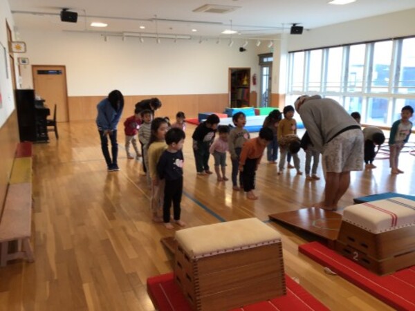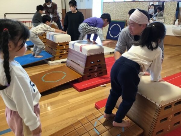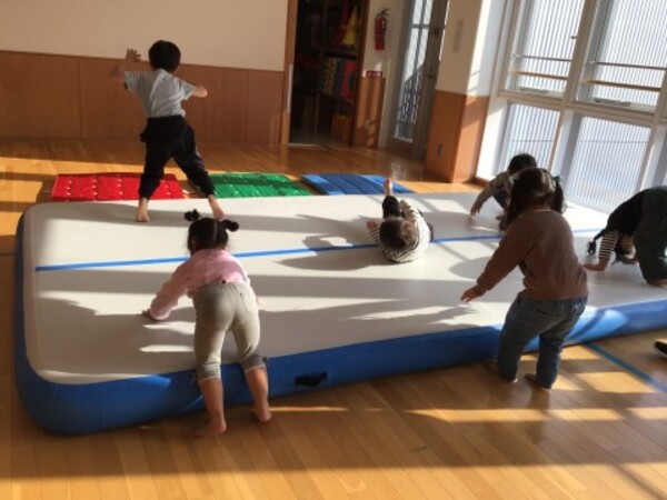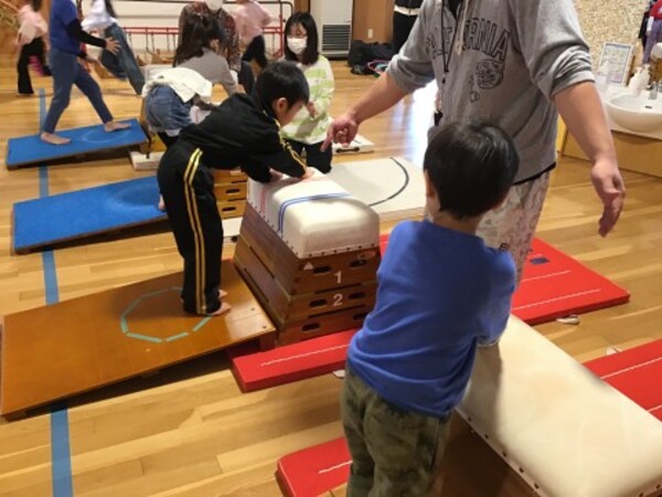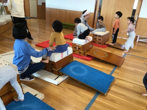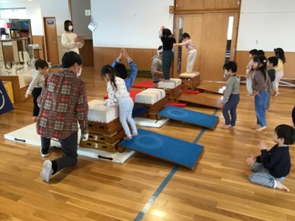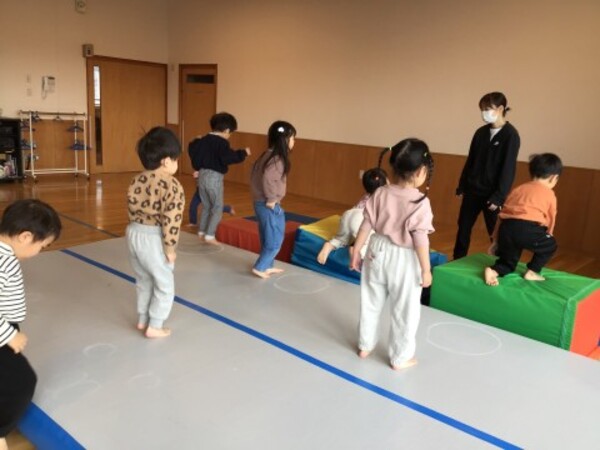 | 11月13日(木)太陽組(4歳児)の太地先生の体操教室がありました。 今日は、跳び箱。おふざけするとけがをするので、ふざけないで楽しみましょう😊 太陽組(4歳児)は「おばけの手」に気をつけて開脚跳びから始まりました。肩を跳び箱に付いたおばけの手より前に出すことを意識して、できるだけ跳び越えられるように挑戦‼️ 助走をつけると続々、跳び越えられるお友だちが増えました。 |