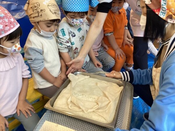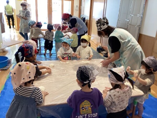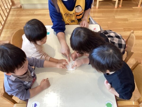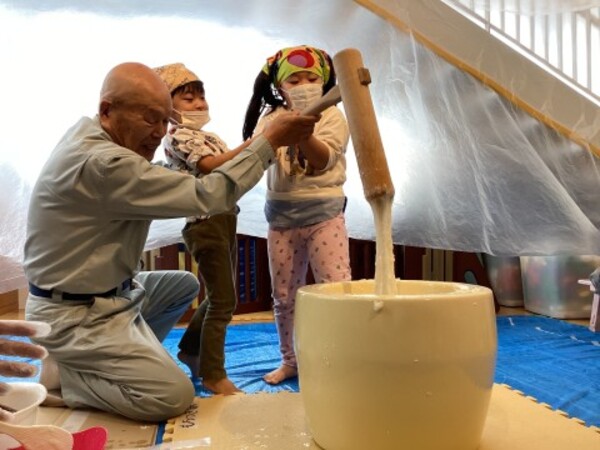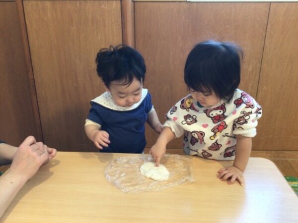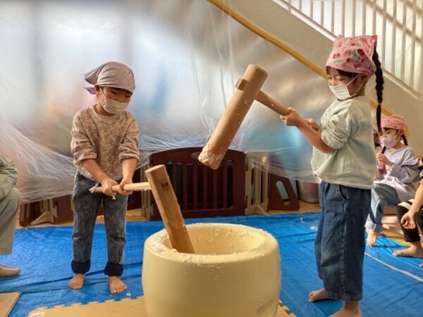 | 12月10日(水)年末の日本の伝統行事「もちつき」をしました。 雪組(0歳児)星組(1歳児)は大きなお友だちがおもちをついている所を見学し、つきあがったおもちをおすそ分けしてもらい、お餅の感触を体験しました。 月組(2歳児)からは杵を持ちおもちをつきました。アツアツに蒸し上がった粒々のもち米が杵で「ペッタンコ ペッタンコ」とついていくうちみ、もちもちのおもちに変わっていく様子を間近で観察し、つきあがったおもちを伸ばしたり丸めたりしておもちの感触を体験しました。 虹組(3歳児)と太陽組(4歳児)はおもちの感触を楽しんだ後に、園の玄関やホールに飾る大きな鏡餅を作りました。 宙組(5歳児)はひとりずつ自分の鏡餅を作りました。 クリスマスも楽しみだけど、お正月も楽しみですね😊 |
