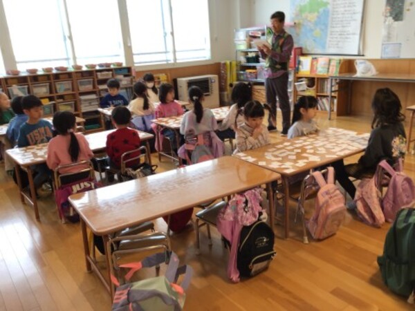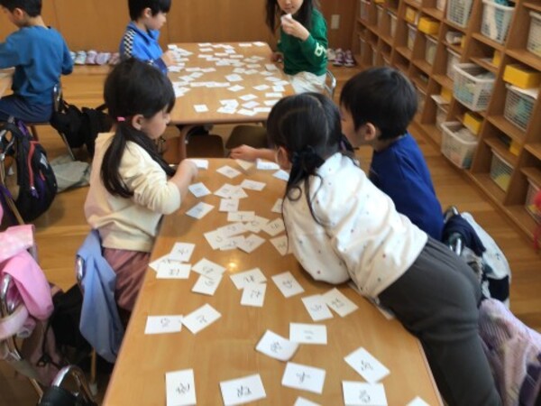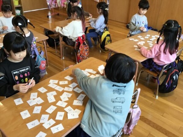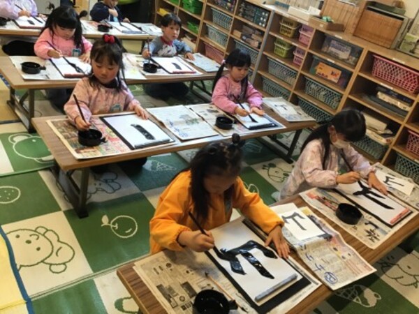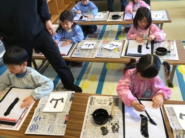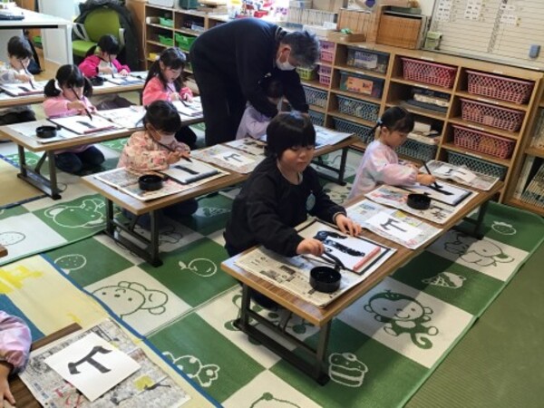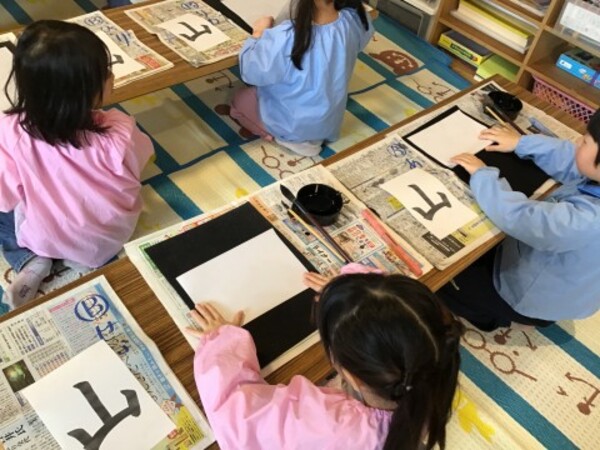 | 2月9日(月)宙組(5歳児)の書道教室と西山先生の運動あそびがありました。 Aグループは書道教室からです。今日は漢字で「山」と書きました。清水先生に「山」の書き始めは斜めから筆を入れねじらずに筆を動かす。書き始めの位置が重要で、筆を立てて書くことを忘れないようにと教えていただき書き始めました。ダイナミックに書くお友だちが多くどっしりとした「山」が書きあがりました。 次の西山先生の運動あそび。今日はお部屋で「文字かるた」。西山先生のお話を聞いてかるたとにらめっこ。勢いよくかるたをとるAグループのお友だちでした。 |