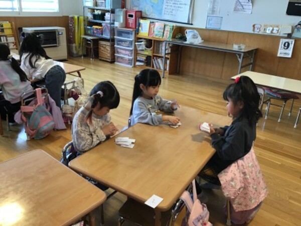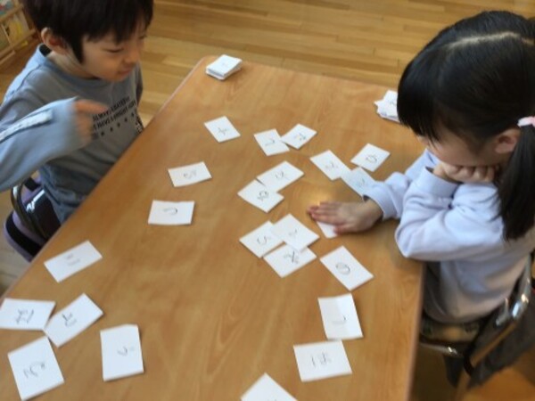 | 2月9日(月)書道教室と西山先生の運動あそびがありました。 Bグループは西山先生の運動あそびからです。Bグループも今日はお部屋で「文字かるた」。集中してかるたを見つめるBグループのお友だちでした。最後は取れたかるたを数え頑張りを讃え合いました。 かるたの後は、書道教室。今日は漢字の「山」に挑戦。半紙はおへその前に置き、テーブルにお腹を付けることに注意しながら書くように清水先生にアドバイスをいただき、筆を立てて集中して立派な「山」を書きあげました。 |