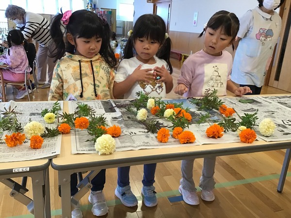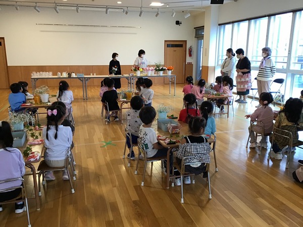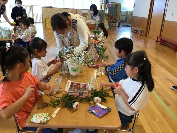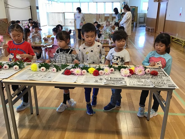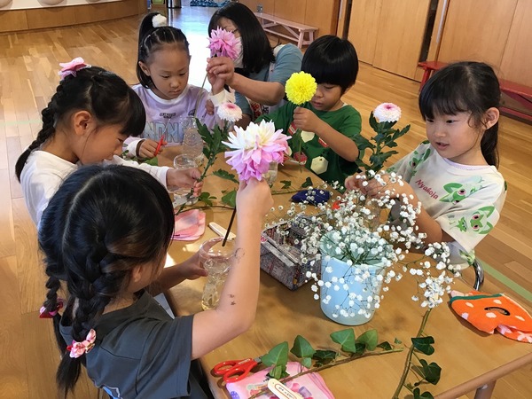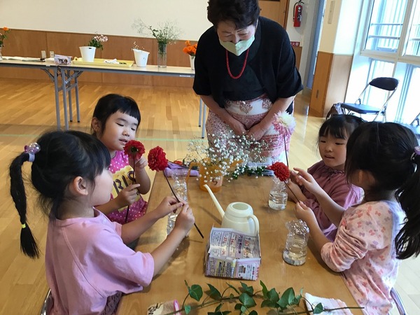 | 9月26日(金) 初めての華道教室 ペットボトルで作った手作りお花器にお花を生けました。今日のお主役のお花は、ダリアとピンポンマム、脇役にカスミソウとアイビーと園で育てたマリーゴールドも添えました。お花となかよしになる為に先生からは 「お花のいい所を見つけたください」と説明をうけて、お花を見つめる子ども達。お花との出会いを大切に!そして、今日来ていただいたほっこり会の先生たちとも楽しく初めての華道教室を終えることができました。 次回10月は茶道教室です。またほっこり会の先生たちに会える事を楽しみしています。ほっこり会の皆さまありがとうございました。 |