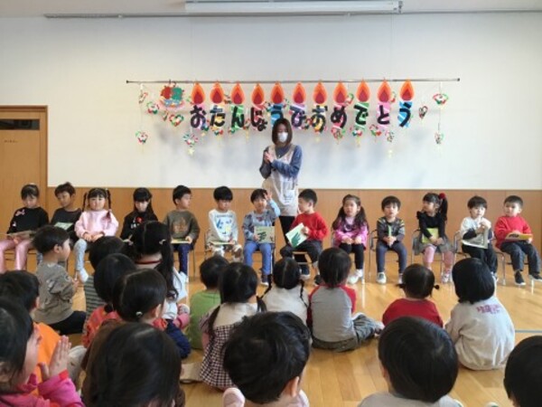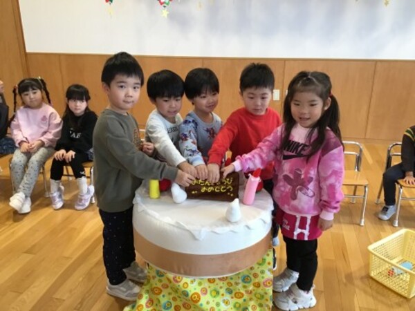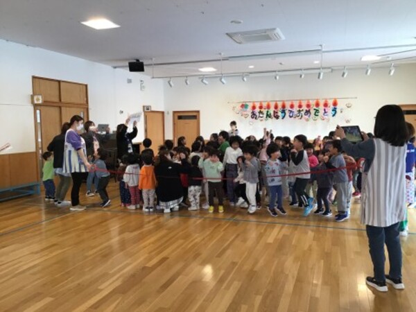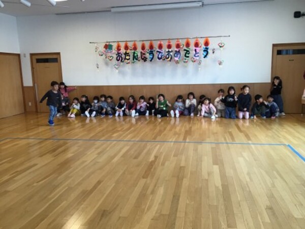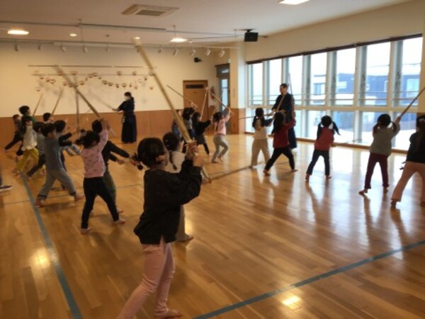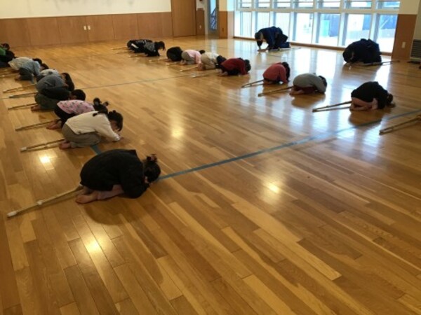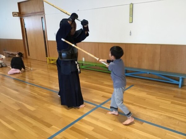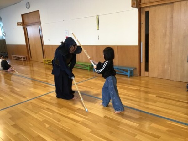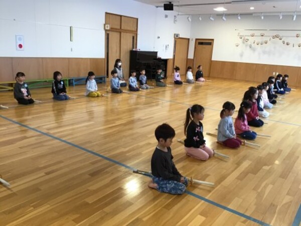 | 12月16日(火)宙組(5歳児)の剣道教室がありました。 剣道教室も今日で3回目となりました。少しずつ正座、黙想、座礼などの礼法にも慣れてきた宙組(5歳児)のお友だち。 前後に進みながらの面打ち、小手打ちもスムーズになりました。 そこで今日は、先生が防具をつけて実際に面打ち、小手打ち、胴打ちを打たせていただきました。防具をつけた先生の姿に「かっこい〜🤩」とどよめきが起こりました。始めは遠慮がちだった宙組(5歳児)のお友だちでしたが、何度か繰り返すうちに大きな声で思いっきり竹刀を振っていました✌️ 今年の稽古も本日が最終日です。「また、来年元気に会いましょう」の先生のお話でおわりました。 神馬辰夫先生、今年も1年ありがとうございました。また来年、よろしくお願いします。 |