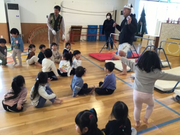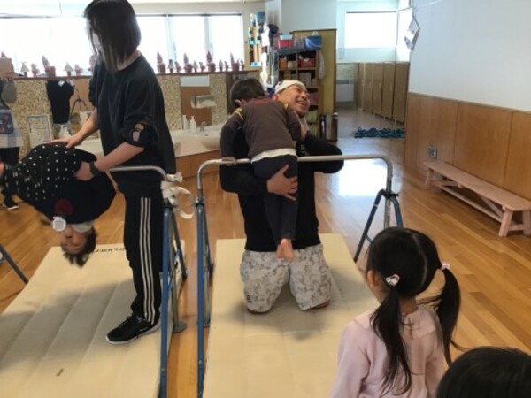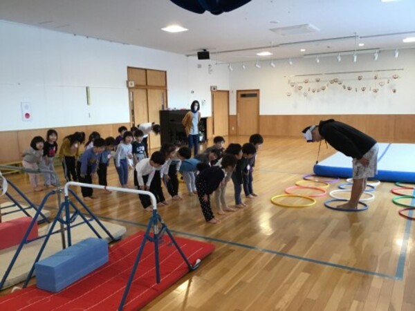 | 12月18日(木)虹組(3歳児)の太地先生の体操教室がありました。 まず始めに太地先生から、今年最後の体操教室です。最後に「よいおとしを おむかえください」の年末のごあいさつをするお約束をして準備体操しバランスゲームに挑戦❗そして鉄棒の前回り降りの練習開始です。前回を思い出し、すずめのポーズから洗濯物のポーズになり手を離さずにぐるんと回ります。何度も何度も挑戦する虹組(3歳児)のお友だちあっという間に終了時間となり、少し残念そうではありましたが、鉄棒と仲良しになれました。 太地先生 ありがとうございました。また来年、よろしくお願いします。 |