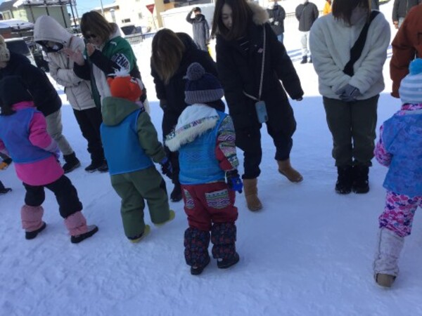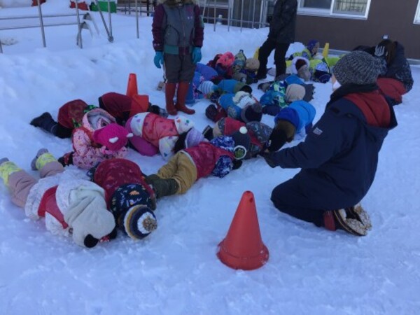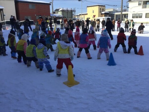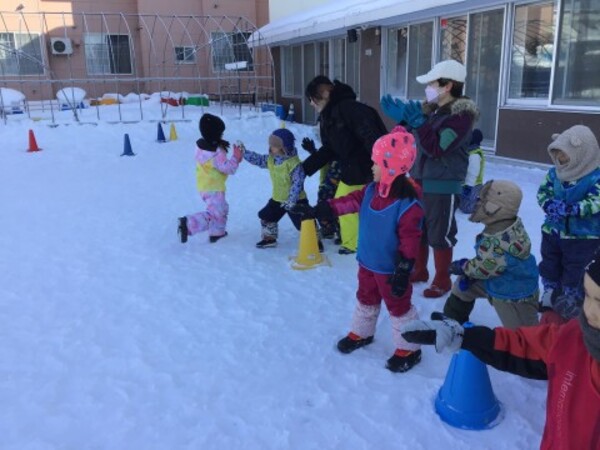 雪中運動会 太陽組(4歳児) 1月29日(木)太陽組(4歳児)の雪中運動会がありました。太陽組(4歳児)のプログラムは1.準備体操 2.宝探しゲーム 3.スノーフラッグ 4.足じゃんけんゲーム 5.3色リレー でした。足じゃんけんゲームは保護者の方々にもご協力いただき寒さに負けず楽しみました。3色リレーでは先生達の熱い戦いもあり盛り上がりました。たくさんの応援、ご協力ありがとうございました。 準備体操 宝探しゲーム 宝物隠し中 目を閉じて待ちます み〜つけた🤗 スノーフラッグ ゲット☝️ 足じゃんけんゲーム お母さん・お父さんとじゃんけん ポン 3色リレー 2026/01/29