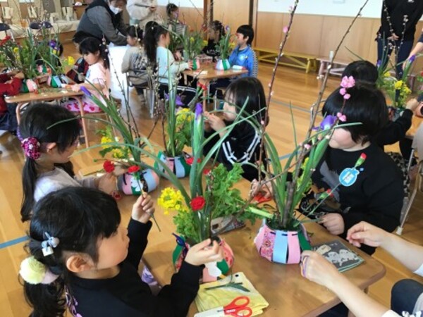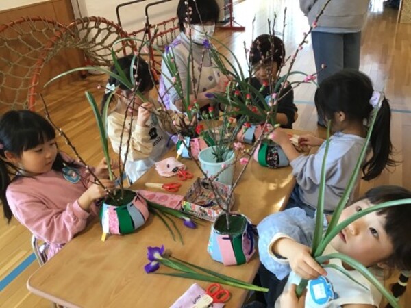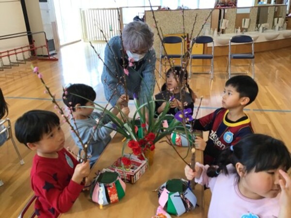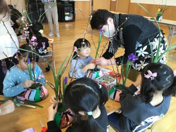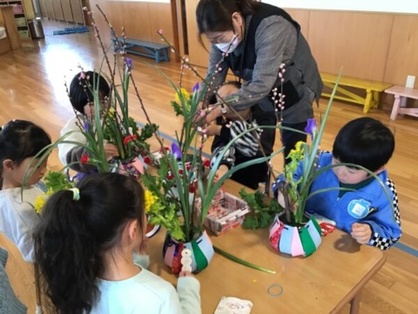 | 2月4日(水)宙組(5歳児)の華道教室がありました。 暦の上では今日は立春。今回は春を感じる桃の花、アイリス、菜の花、カーネーション、かすみ草・・・いつもよりたくさんの種類のお花を生けます。 ほっこり会のみなさんにお手伝いいただき、お花たちとの会話を楽しみながら、オアシスにお花を生ける宙組(5歳児)のお友だち。今回も立派な生け花ができました。 熊野先生、ほっこり会のみなさんにありがとうございました。 |