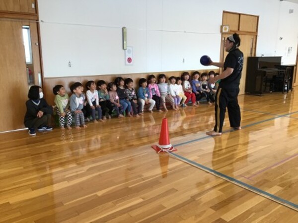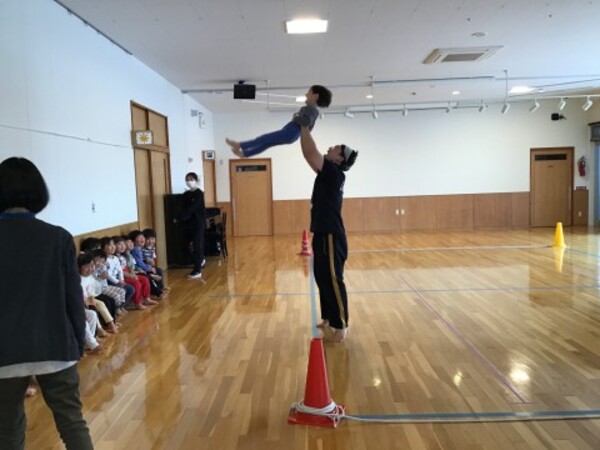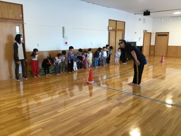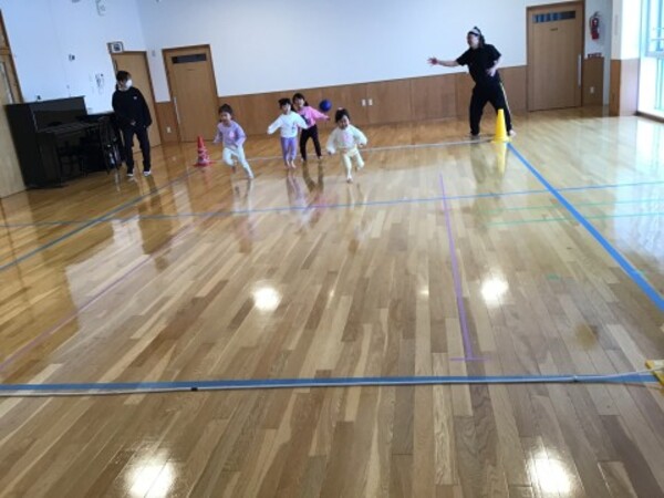 太地先生の体操教室 虹組(3歳児) 2月19日(木)虹組(3歳児)の太地先生の体操教室がありました。今日は「ドッチボール」虹組(3歳児)は大喜び!「チャンピオン ドッチボール」のルールを教えてもらいゲームスタート☝️ボールを投げるのは先生方、チャンピオンになるために一生懸命逃げていました。「ボールにぶつかっても泣かずにみんながんばりましたね」と最後に太地先生に褒めていただき今日の体操教室は終了です。 おねがいします ルールの説明を聞きます 逃げる 男の子 逃げる 女の子 チャンピオンを讃える舞 ありがとうございました 2026/02/19
