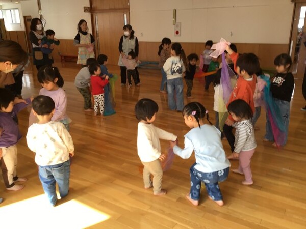 | 3月2日(月)書道教室と園長先生のわらべうたあそびがありました。 Aグループは書道教室から始まりました。「今日が最後の書道教室です」と清水先生からお話があり、一瞬緊張感が漂いました。 今日は漢字の「友」を書きました。「右はらい」や「左はらい」筆づかいを教えていただき、個性豊かな「友」が書きあがりました。 書道教室の次は、園長先生のわらべうたあそびです。2階ホールにやって来た星組(1歳児)とリトミックスカーフであそんだ後「あんたがたどこさ」のうたに合わせ手や膝で拍子をとったり、ボールを投げたりして園長先生とわらべうたあそびを楽しみました。 清水先生1年間ありがとうございました。 |