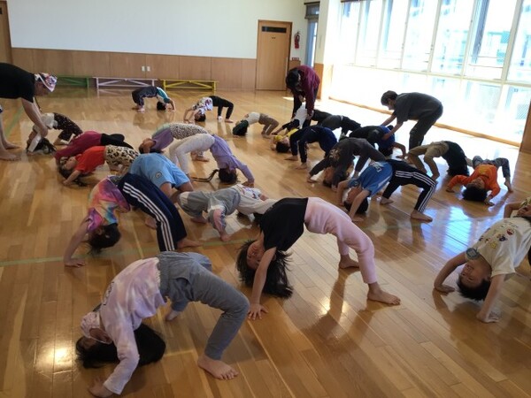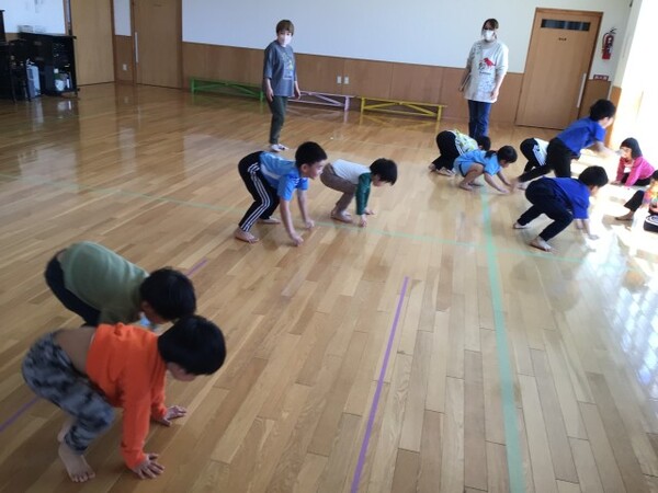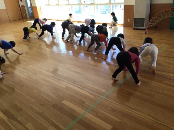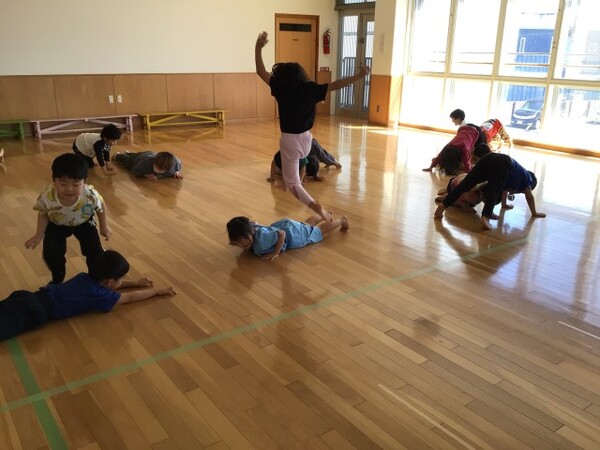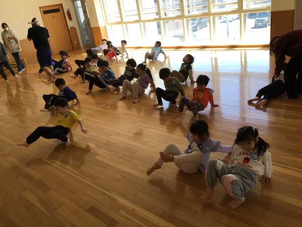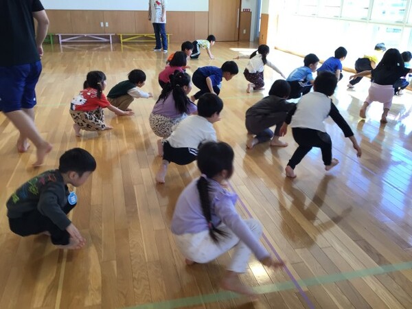 太地先生の体操教室 宙組(5歳児) 4月16日(木)太地先生の名前とお約束を確認してから宙組(5歳児)になって初めての太地先生の体操教室がありました。ブリッジも様になり、動きも機敏な宙組(5歳児)!今日は準備体操、すわりあそびから始まり、忍者に変身して赤ちゃんアヒル、ワニ🐊ヘビ🐍うさぎ🐰どんぐりにのっそりくま🐻クモ🕷️かえる🐸になりきって身体を動かしました。そして最後は、お友だちとふたり一組で足や身体を使いトンネル・ジャンプで盛り上がりました✌️ ブリッジ 赤ちゃんアヒル のっそりくま🐻 クモ歩き🕷️ カエル🐸 ふたり 一組でトンネルジャンプ 2026/04/16